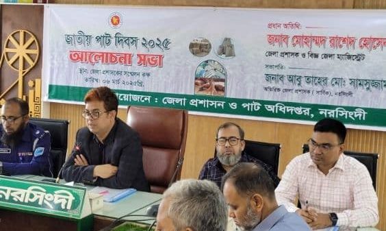 অদ্য ৬/৩/২৪ ইং বৃহস্পতিবার সকালে জেলা প্রশাসকের সম্মেলন কক্ষে অতিরিক্ত জেলা প্রশাসক (সার্বিক) আবু তাহের মোঃ শামসুজ্জামান এর সভাপতিত্বে ও নরসিংদী পাট অধিদপ্তরের উন্নয়ন কর্মকর্তা মো: খোরশেদ আলম এর সঞ্চালনায় অনুষ্ঠানে স্বাগতিক বক্তব্য রাখেন পাট অধিদপ্তর কর্মকর্তা মো: আজমত আলী আকান্দ রেজাউল। প্রধান অতিথি হিসেবে উক্ত অনুষ্ঠানে বক্তব্য রাখেন নরসিংদী জেলা প্রশাসক মোহাম্মদ রাশেদ হোসেন চৌধুরী।